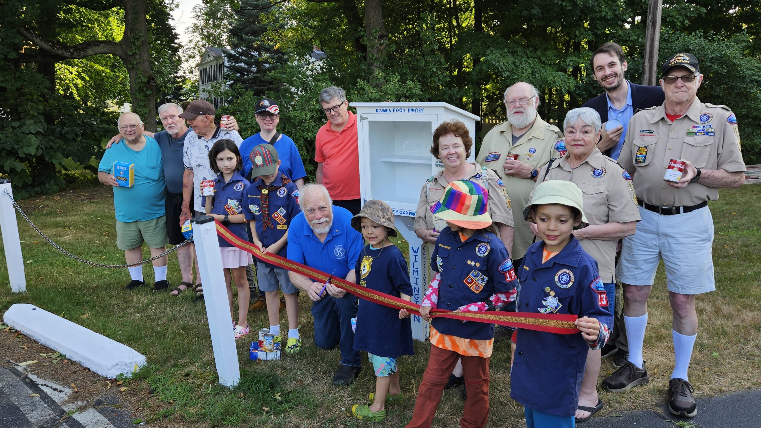 BELOW: Members of the Kiwanis Club were joined by folks from the Congregational Church and Scout Pack 136 at the installation and loading of the Kiwanis Mini Food Pantry.