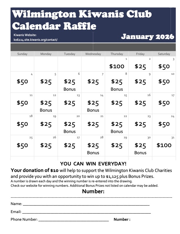 Available from Club members: A new Calendar Raffle. Tickets available for only $10. Win a prize every day. Winners will be drawn in January 2026. Winning Numbers will be put back in the raffle. You can win Every Day. BONUS PRIZES on many days. Additional Bonus Prizes will be added until the drawing starts.